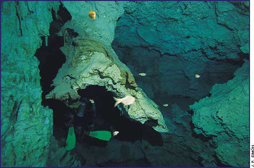 at 50-60 feet and often we can make a complete circuit of the cenote in 40