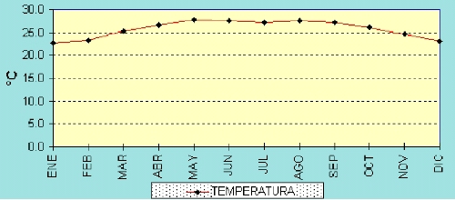 5 degrees C. The maximum is around 28 degrees C and the minimum is around 23