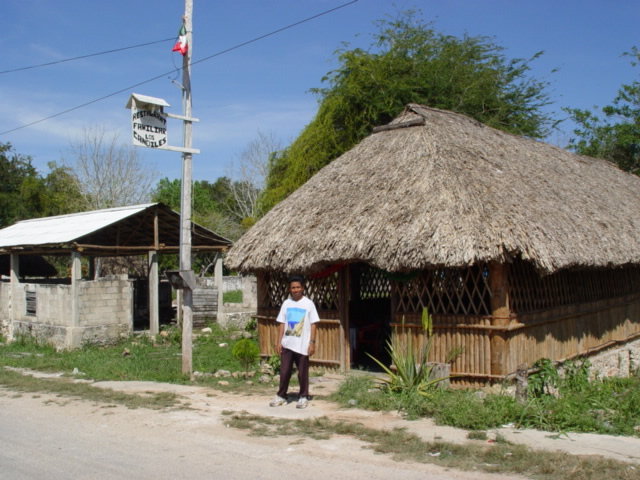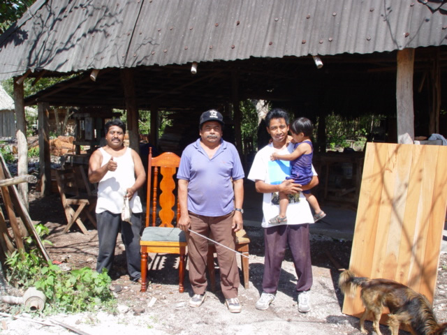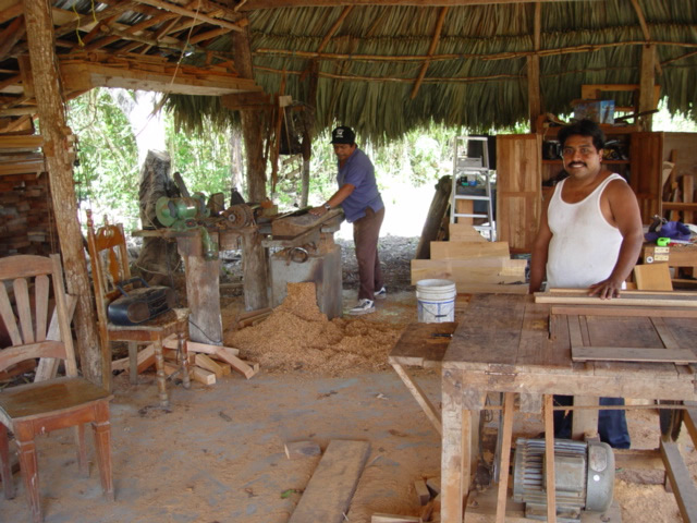north of Xcalak. During our visits to the Yucatan we would take note of the architectural features of the buildings we would see. This research eventually led to our design of the house we are about to construct. ____________________________________________________________________ As we neared completion of the house it became necessary to begin furnish it. Last November we stayed in Cancun and visited every furniture store we could track down. We were looking for furniture that was rustic in appearance and comfortable. We were able to locate a few pieces at the "EL Baulito" store on Av. Sunyaxchen in downtown Cancun. We found the futons we wanted at the "Liverpool" store in Plaza las Americas. We made arrangements to have a truck to haul these and other items to Xcalak. In Chetumal we were only able to find a small coffee table and some mirrors. After returning in frustration to Xcalak we heard that there was a furniture factory in Noh-Bec. Noc-Bec is a small town west of Rte 307 approximately 12km north of Limones. We went to Noh-Bec and couldn't find the factory. We were about to return when we came across a young man riding down the road on a bicycle. In my best bad spanish I asked him "donde esta la fabrica para muebles". He replied in perfect english "so you are looking for some furniture". It turns out that his father is a carpintero and has a shop in the next town. Fernando took me to his restaurant in Noh-Bec and then led us to his fathers shop in Polinkin which is only 1km from his restaurant. Fernando introduced me to his father who showed me a catalog of some of the work he has done. Although his place doesn't look like much from the outside it soon became apparent that Senor Candido was a fine furniture maker. We designed an armoire for the second floor, chose what species of wood to use, agreed to a price and made arrangements to have the piece shipped to Xcalak after it was done. When we returned to Xcalak last month we were very pleased when we saw the armoire for the first time. We returned to Noh-Bec, found Fernando and returned to Candido's shop. We ordered a small dining room table with chairs, end table, bookcase and a dresser. We again made arrangements to have the furniture delivered to Xcalak. If we would have known about Candido when we started out we would have saved countless hours and aggravation looking for furniture. He can construct wood furniture in almost any style you want and his prices are very reasonable. The fact that he is relatively nearby and will deliver is a big plus. ___________________________________________________________________